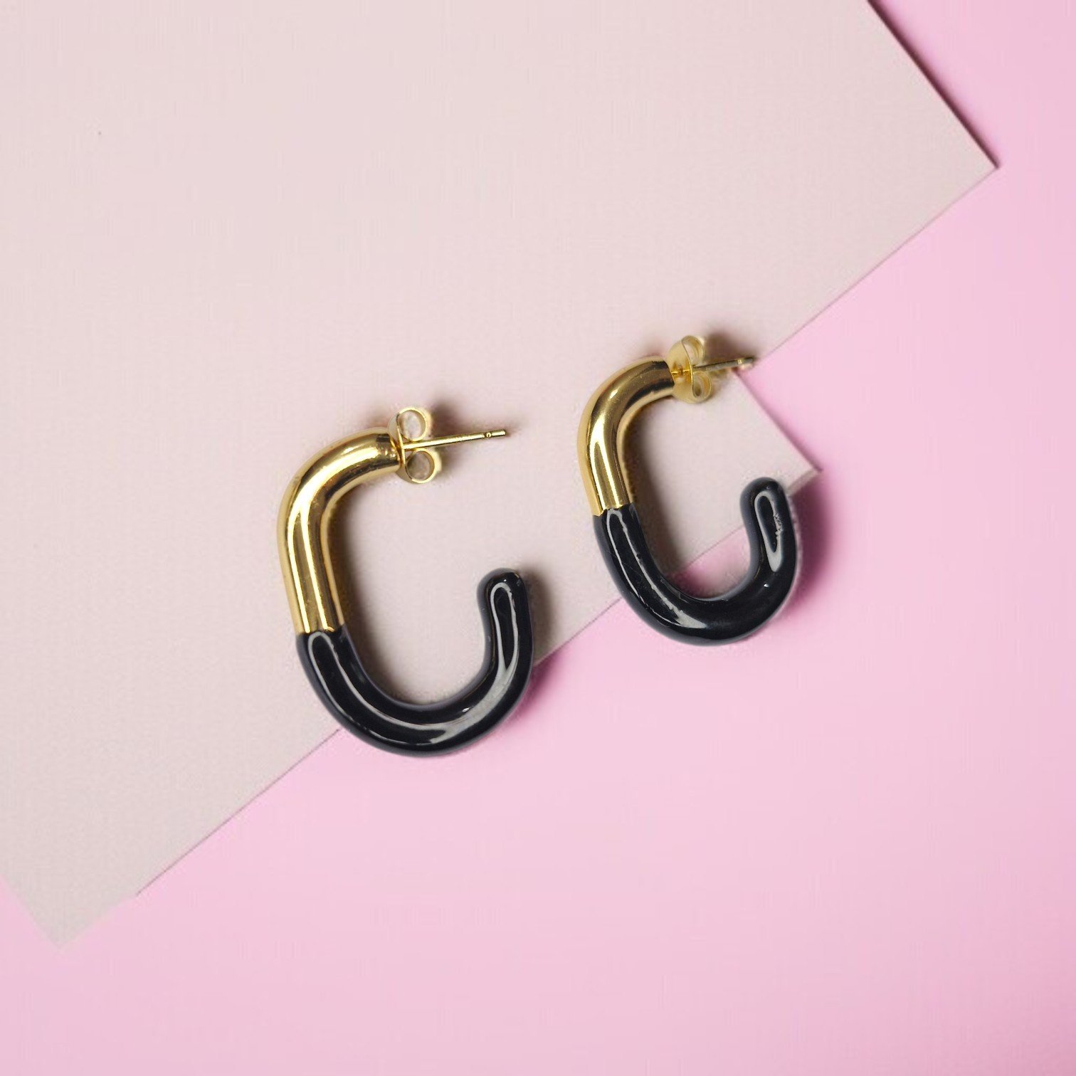Make a statement with these bold and modern Two-Tone Crescent Hoop Earrings from Aura Jewels. These eye-catching earrings feature a striking contrast of black and gold, adding a touch of contemporary chic to any outfit. The unique crescent shape adds a touch of playful elegance, making them the perfect accessory to express your unique style.